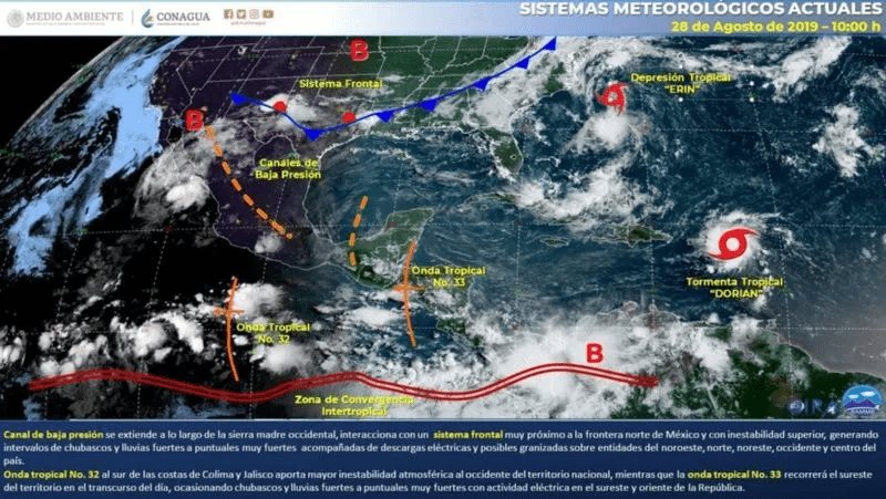 Las condiciones meteorológicas señaladas serán generadas por la Onda Tropical Número 32, que se extenderá al sur de las costas de Jalisco, la Onda Tropical Número 33, en interacción con un canal de baja presión ubicado sobre el sureste de México, un frente frío localizado sobre la frontera norte de la República Mexicana, el cual se combina con otro canal de baja presión, pero extendido sobre la Sierra Madre Occidental, y el ingreso de humedad proveniente del Golfo de México y el Océano Pacífico.