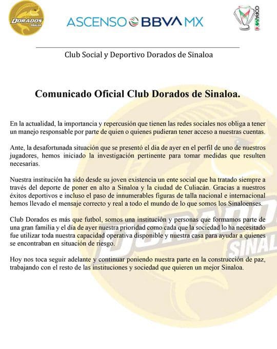 “Ante la desafortunada situación que se presentó el día de ayer en el perfil de uno de nuestros jugadores, hemos iniciado la investigación pertinente pata tomar medidas que resulten necesarias”, dijo.
