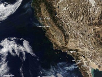 Para darnos una idea de la magnitud de lo que sucede, la NASA (National Aeronautics and Space Administration) ha dado a conocer algunas imágenes satelitales de cómo se ve el humo que han dejado los incendios en Baja California y California.