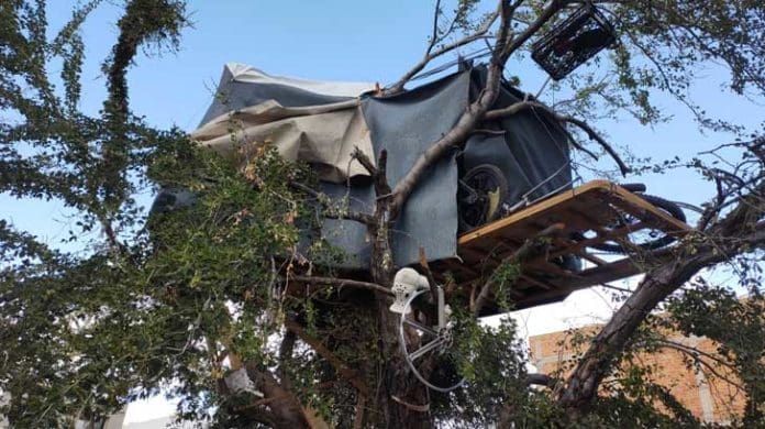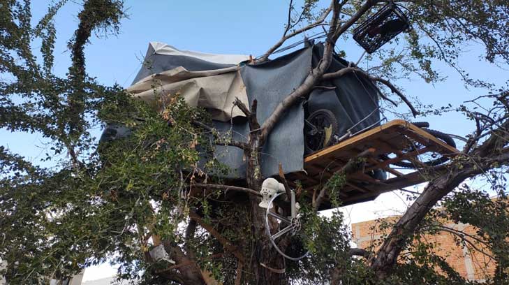 HERMOSILLO, SON.- Manuel Gálvez construyó una casa en un árbol, dentro del estacionamiento privado donde trabaja de guardia, la usa para dormir y evitar las noches frías que tiene que pasar, desde que falleció su esposa ha vivido en la calle.