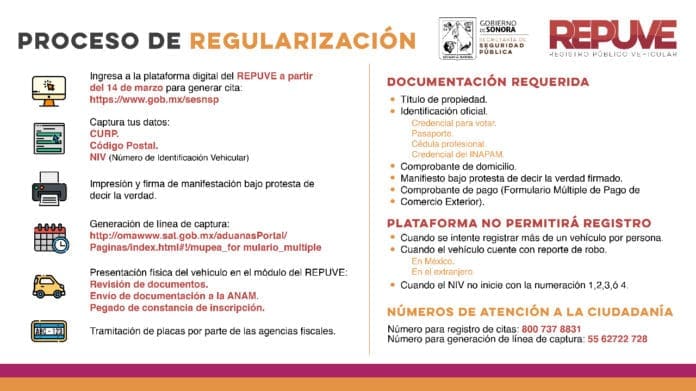 La titular de la Secretaría de Seguridad Pública en el estado puntualizó que el proceso iniciará con vehículos modelos 2003 y anteriores; y los interesados deberán generar cita a través de la plataforma de Repuve www.gob.mx/sesnsp y presentar CURP, comprobante de domicilio, número de Identificación vehicular y datos de contacto.