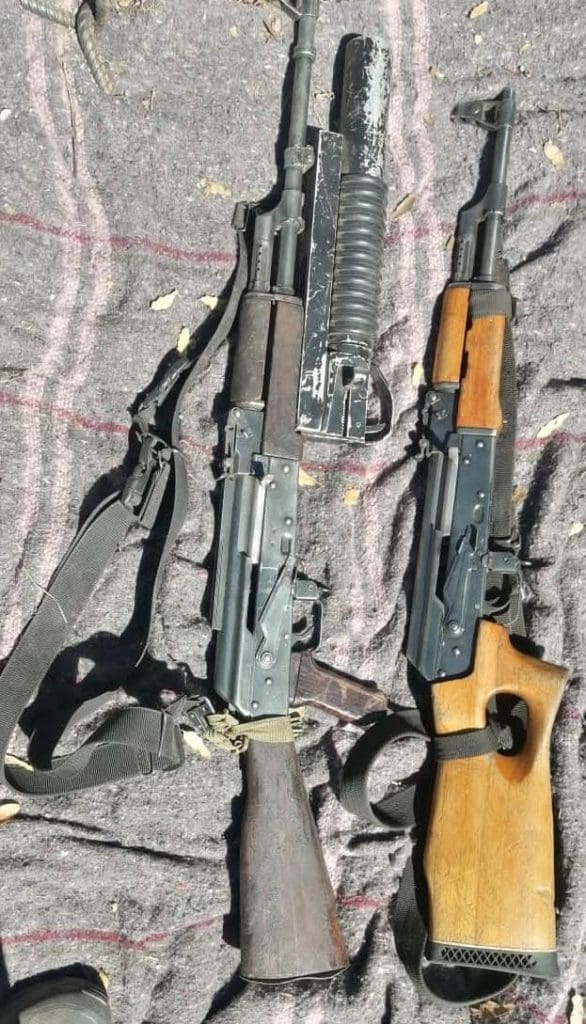 Al revisarlo, en el interior había dos armas de fuego calibre 7.62x39mm, conocidas como AK-47, 426 cartuchos, 12 cargadores y cinco bolsas que contenían hierba verde con características físicas al narcótico.