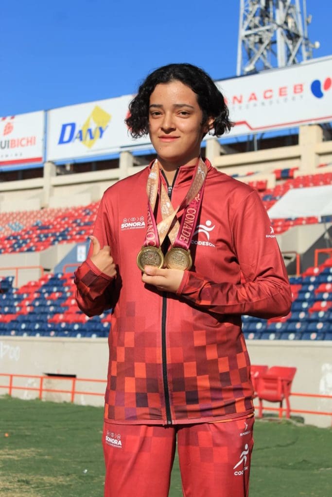 La joven de la delegación “Sonora Yo’ One” ganó preseas del máximo color en impulso de bala (6.37 metros) y en lanzamiento de disco (16.16) en la categoría Juvenil Superior, clasificación F36.