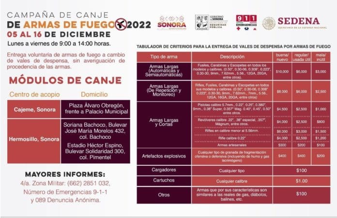 Del 5 al 16 de diciembre se llevará a cabo la Campaña de Canje de Armas de Fuego 2022 en Sonora, donde las y los ciudadanos podrán entregar material bélico, a cambio de vales de despensa, que van desde los 100 hasta diez mil pesos, anunciaron la Secretaría de Seguridad Pública (SSP) y Secretaría de la Defensa Nacional (Sedena).