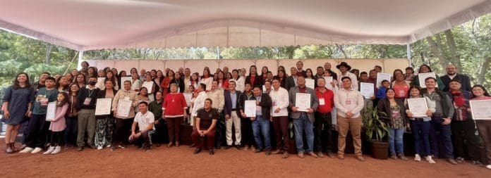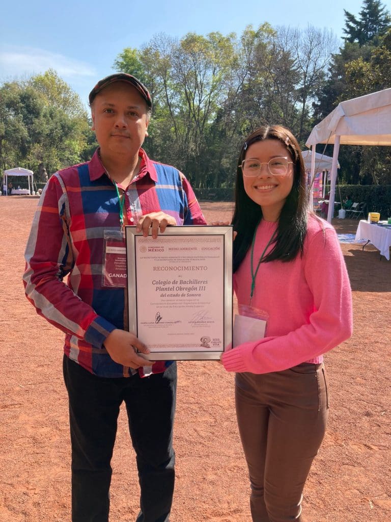 El maestro del campo de Ciencias Experimentales, Emanuel Valenzuela Rodríguez acudió, junto con la alumna Cecilia Nobali Rodríguez Hernández y la madre de familia Cecilia Hernández, a la Ciudad de México a recibir la distinción en un evento encabezado por María Luisa Albores González, titular de Semarnat y Leticia Ramírez Amaya, secretaria de Educación Pública.