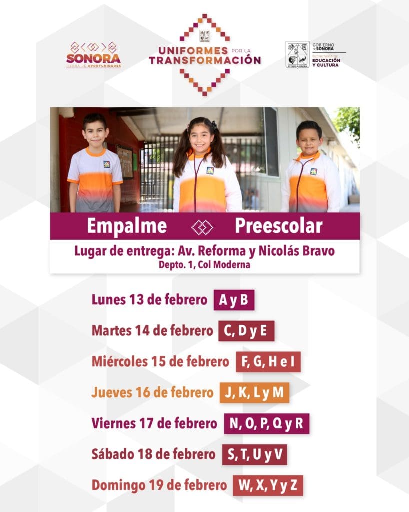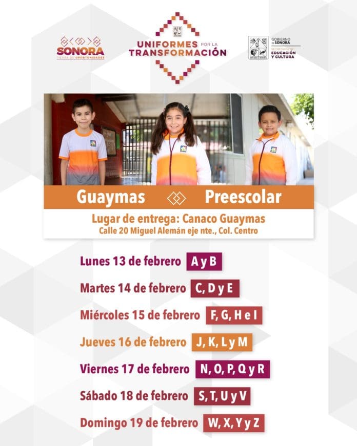 A partir del lunes 13 de febrero y hasta el domingo 19, se entregarán los paquetes de uniformes escolares deportivos, por orden alfabético, únicamente al alumnado de preescolar en Ciudad Obregón, así como en los municipios de Cajeme, Guaymas y Empalme, anunció Samuel Espinosa Guillén.