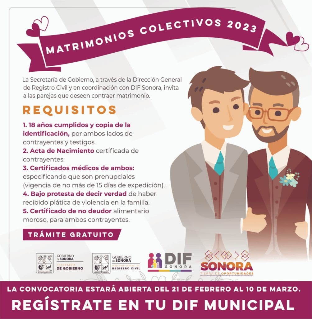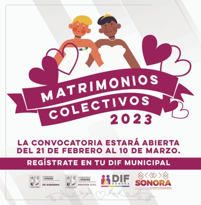 La certeza legal es para todas las parejas que deseen contraer matrimonio, por eso el Gobierno de Sonora, a través del Sistema para el Desarrollo Integral de la Familia (DIF Sonora) y Registro Civil, anunció la continuación de la convocatoria para matrimonios colectivos, la cual permanecerá abierta hasta el viernes 10 de marzo.