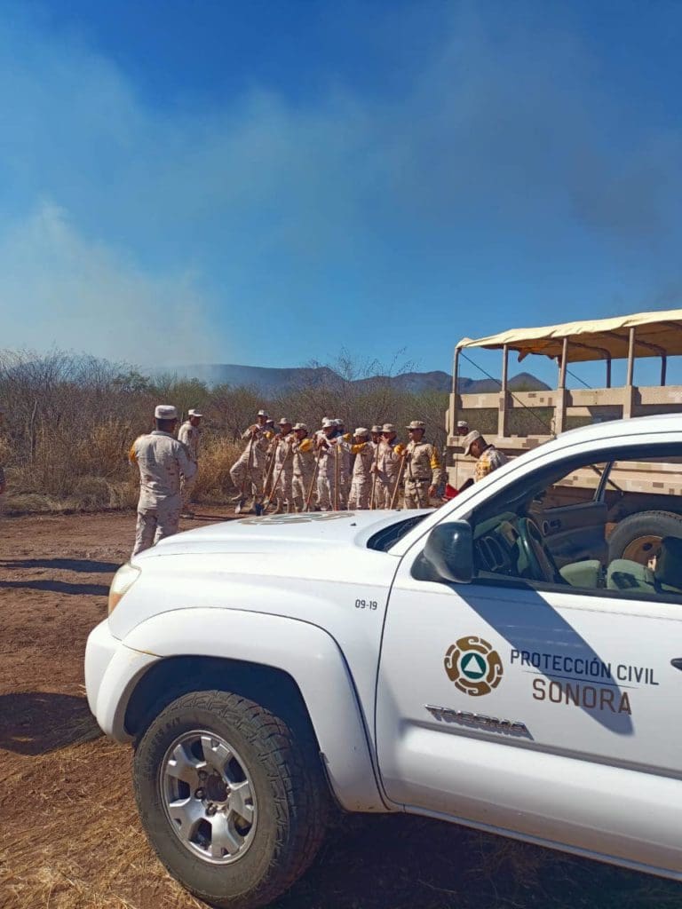En lo referente al incendio que afecta tres municipios en el sur de Sonora, se unieron a su combate elementos de Secretaría de la Defensa Nacional (Sedena), Policía Estatal de Seguridad Pública (PESP) y Protección Civil Sonora, mismos que ya se coordinan con bomberos de Cajeme, Rosario de Tesopaco y rancheros afectados de la zona.