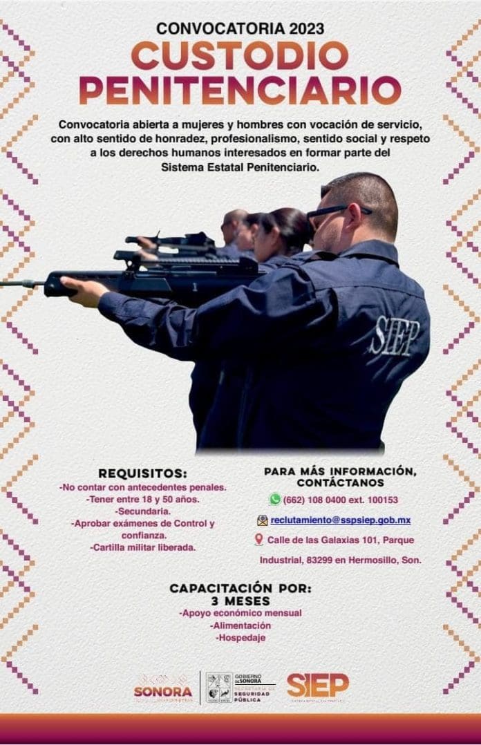 Para mayores informes sobre la convocatoria, comunicarse al teléfono (662) 108 04 00, extensión 100153 o escribir al correo electrónico reclutamiento@sspsiep.gob.mx.