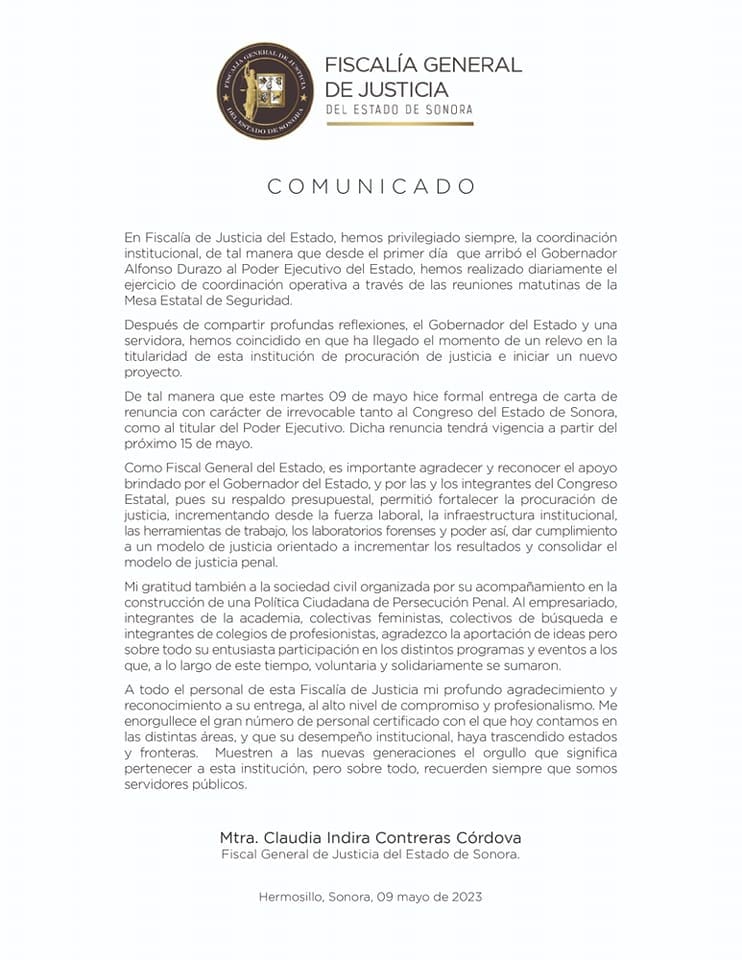 Claudia Indira Contreras dio a conocer este martes su renuncia a la titularidad de la Fiscalía General de Justicia de Sonora, misma que será efectiva a partir del 15 de mayo.