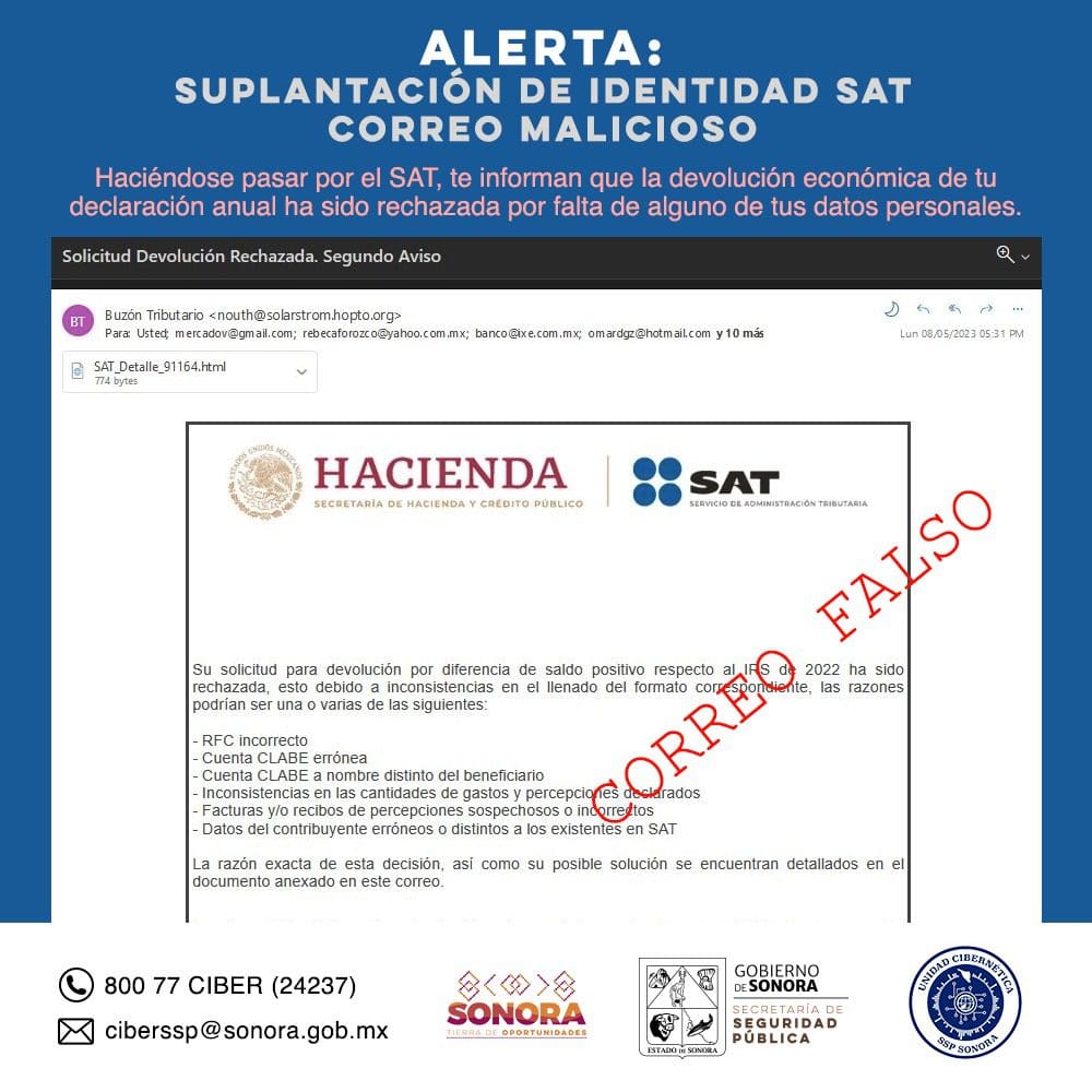 Mediante reportes ciudadanos, la dependencia detectó un correo malicioso haciéndose pasar por el SAT, supuestamente rechazando la devolución de impuestos por falta de datos.