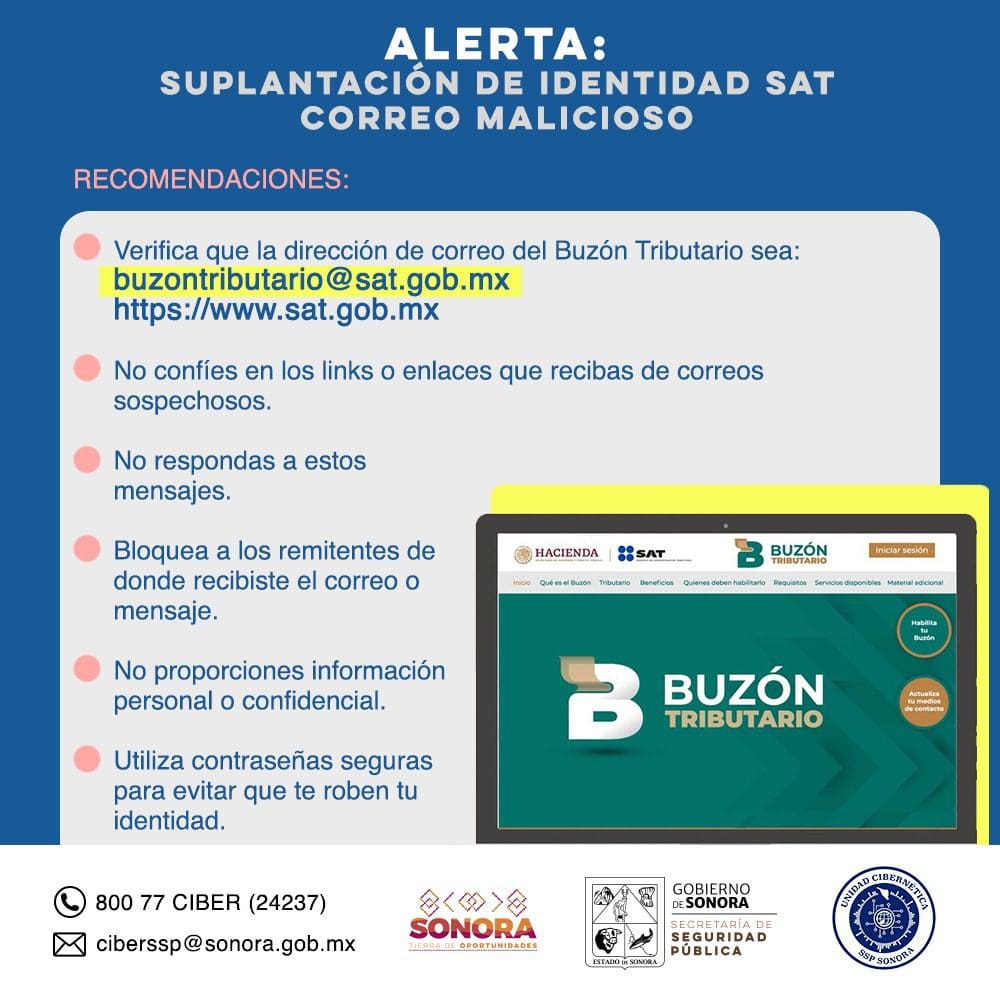 Para prevenir estos delitos, la Unidad Cibernética recomendó verificar que la dirección de correo sea buzontributario@sat.gob.mx o ingresar a www.sat.gob.mx.