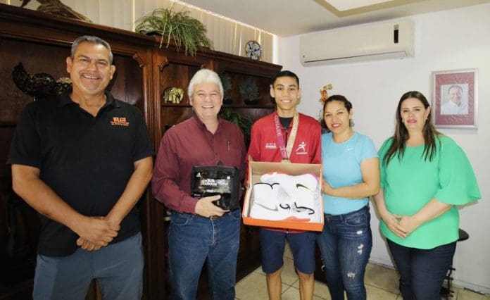 Hernández López fue acompañado por su mamá, Dulce María López Laguna, para recibir el material deportivo que utilizará en ese próximo compromiso deportivo.