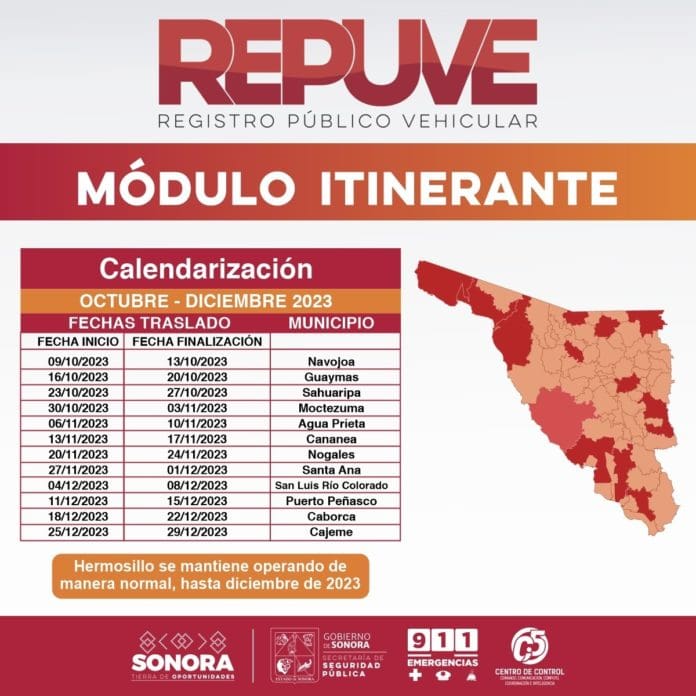 González Caballero informó que el módulo de Repuve estará en Navojoa del nueve al 13 de octubre, del 16 al 20 en Guaymas, del 23 al 27 en Sahuaripa y del 30 de octubre al tres de noviembre en Moctezuma. De igual forma la unidad itinerante tendrá presencia Agua Prieta del seis al 10 de noviembre, en Cananea del 13 al 17 de noviembre, en Nogales del 20 al 24 de noviembre y en Santa Ana del 27 de noviembre al primero de diciembre.