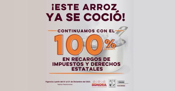 El director general de Recaudación de la Secretaría de Hacienda, Jorge Iván de la Rosa Flores, anunció que gracias a la favorable respuesta de las familias sonorenses, así como a los comercios e industrias establecidas en el estado, se podrán aprovechar el 100% de descuento en recargos de revalidación anual de placas vehiculares, así como el 100% de descuento en recargos a aquellos contribuyentes que cumplan con el pago del Impuesto sobre Remuneraciones al Trabajo Personal durante todo diciembre.