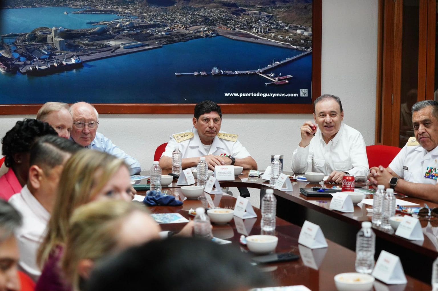 En el inicio de los trabajos de la reunión binacional, el mandatario estatal visitó el Puerto de Guaymas acompañado por el embajador de Estados Unidos en México, Ken Salazar, para exponer las acciones de modernización, así como la ampliación del aeropuerto, cuyas obras convierten al estado en la opción más atractiva para las industrias extranjeras ante la saturación de puertos en Estados Unidos.